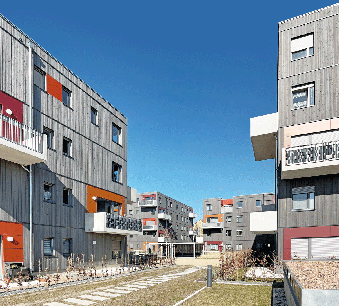 Das etwa 11.000 m² große Areal war bis vor wenigen Jahren mit mehreren 11-geschossigen Wohngebäuden bebaut, die abgebrochen wurden. Das städtebauliche Konzept sieht bis zu 7 Gebäude vor, die um einen rechteckigen Innenhof herum gruppiert sind. Auf der Basis eines Grundmoduls wurden Wohnungen unterschiedlicher Größe und Raumstruktur entwickelt, die die Errichtung von 2- bis 5-Raum-Wohnungen und mit Hilfe von Schalträumen unterschiedliche Wohnungskonstellationen innerhalb eines Gebäudes ermöglichen. Durch die unterschiedliche Zusammenstellung verschiedener Wohnungs-Grundtypen entstanden drei unterschiedliche Gebäudekörper. Die alternierende Anordnung der Gebäude um einen Hof bildet einen klar definierten Außenraum nach innen und eine bewegte städtebauliche Figur nach außen. Die Offenheit angrenzender Wohnbebauungen wird fortgeführt und um eine zeitgenössische Variante mit einem zentralen Hofraum ergänzt. Die Errichtung von zunächst sechs Wohngebäuden erfolgte in zwei Etappen. Ausgeführt wurden knapp 100 Wohneinheiten, überwiegend als 3- und 4-Raum-Wohnungen in vier- und fünfgeschossigen Gebäuden. Die Gebäude mit vorgefertigten Außenwänden als Holzfachwerkkonstruktion mit Holzfaserdämmung und Lärchenholzschalung, Fernwärme- und Regenwassernutzung erfüllen hohe Anforderungen an Nachhaltigkeit. Eine zentrale Tiefgarage ermöglichte den weitestgehenden Verzicht auf oberirdische Stellplätze. Der vorhandene Großbaumbestand konnte zu großen Teilen erhalten werden.